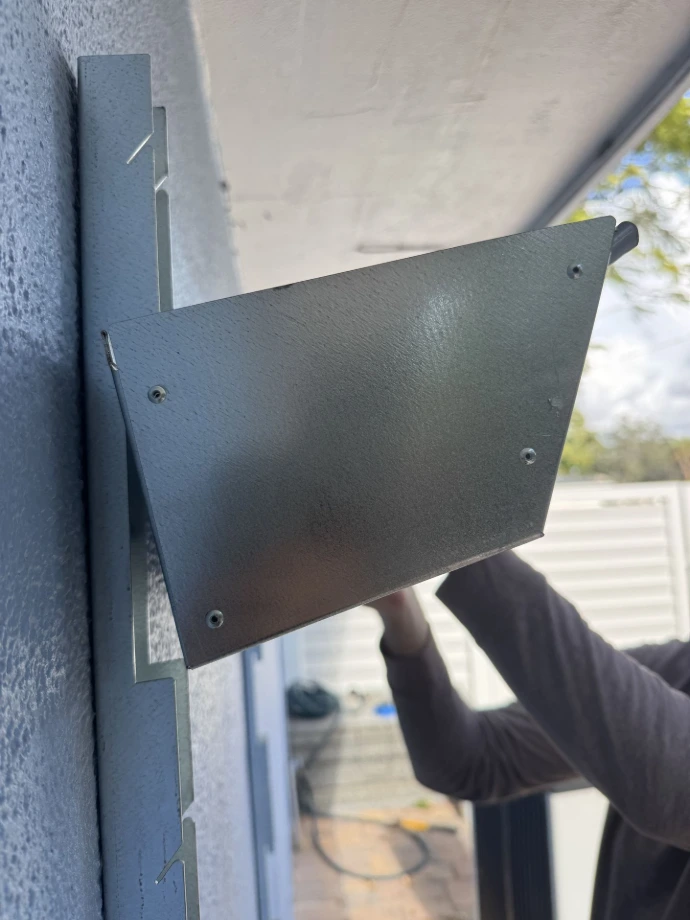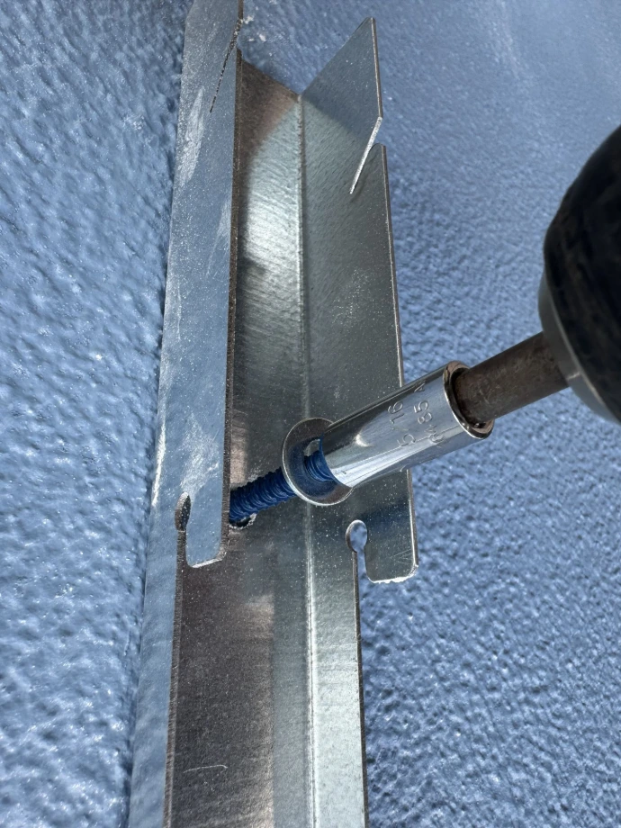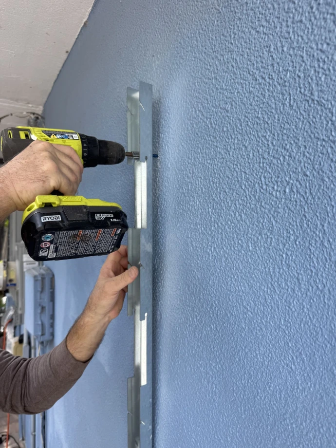 Make sure your second bracket is level with the previous one installed. Mark holes and drill them out. Secure with Tapcons.