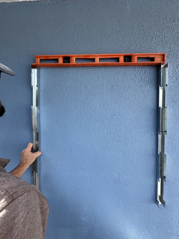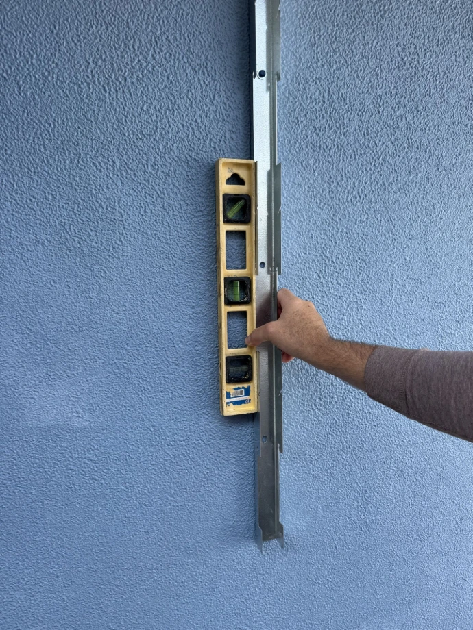 Make sure it is level using 3–4-foot level, drill bottom and center holes. Fasten with Tapcon.